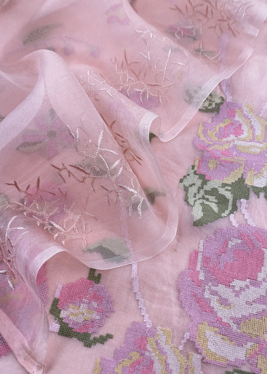 Senorita Dreamy Pink Handloom Organza Silk Suit Fabric With Cross-Stitch Embroidery
