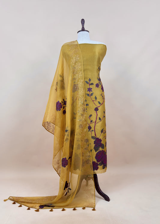 Garden Of Dreams Luxe Rust Orange Handloom Kora Silk Suit Fabric With Appliqué Work And French Thread Embroidery