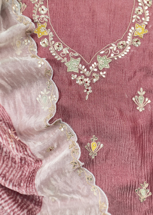 Purple Embroidered Organza Silk Unstitched Suit With Bandhani Dupatta