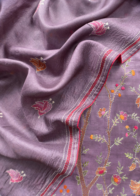 Indigo Purple Kantha Embroidered Unstitched Suit In Handloom Tussar Silk