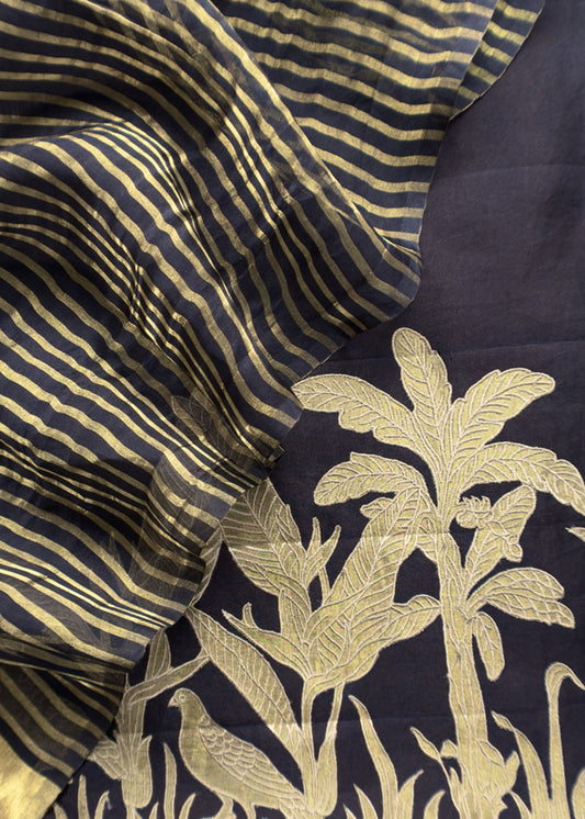 Kalasheel Luxe Black Kora Silk Kurta With Tissue Silk Dupatta With Tissue Appliqué Work
