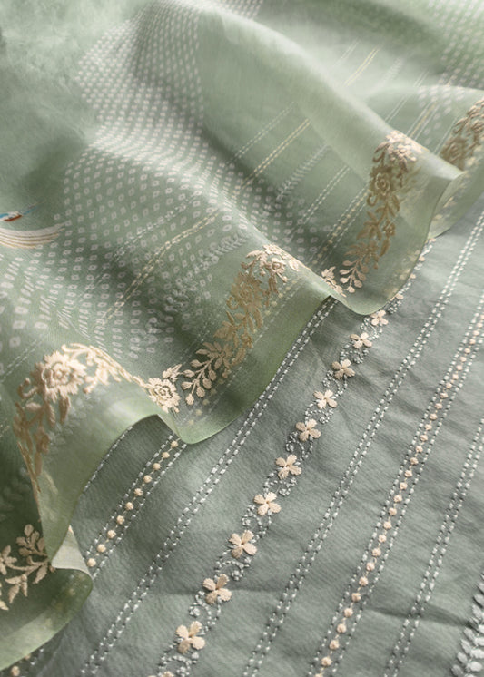 Handloom Organza Suit With Bandhani Print And Parsi Embroidery