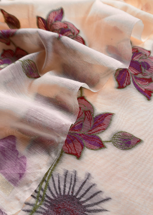 Peach Floral Paradise Jute Linen Suit fabric with shaded Jamdani weaving