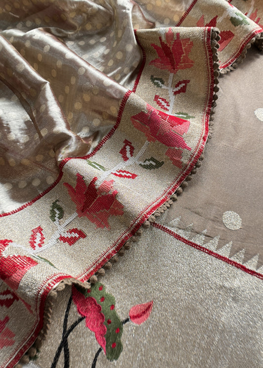 Luxe Golden Brown Handloom Self Tissue Silk Suit And Silk Dupatta With Paithani Weaving