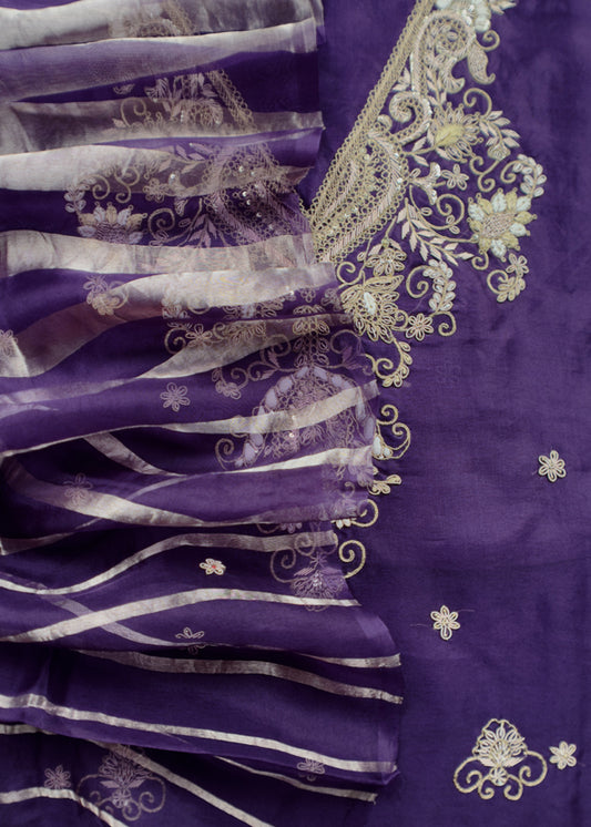 Luxe Violet Silk Suit Fabric And Organza Panel Dupatta With Dabka, Dori And Zardosi Handwork