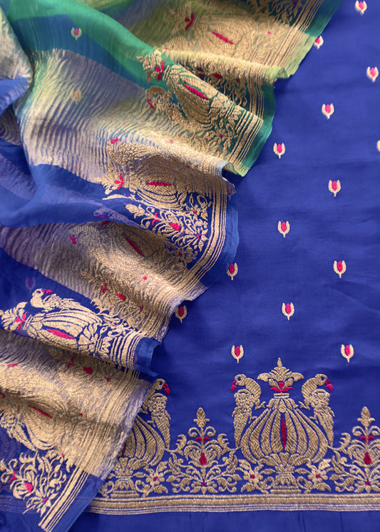 Royal Blue and Green Tyohar luxe Mor Pure Kora Silk Kurta with Double Panel Crushed Tissue Dupatta