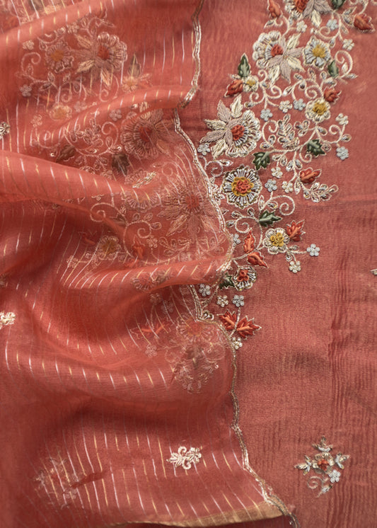 Garden Of Dreams Luxe Rust Orange Handloom Kora Silk Suit Fabric With Appliqué Work And French Thread Embroidery