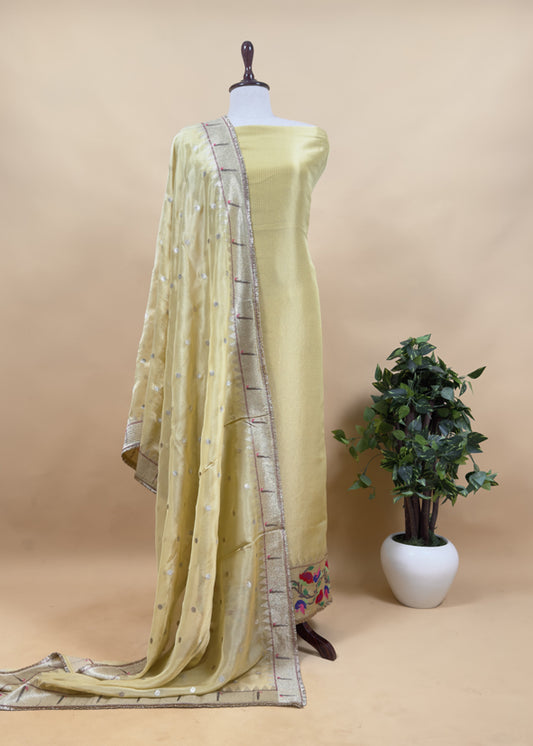 Luxe Gray Handloom Self Tissue Silk Suit Fabric With Paithani Weaving And Jhalar Gota Laces
