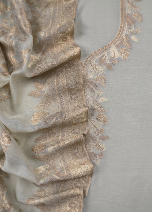 Cheeku Grey Pure Silk Suit With Kani Gold Zari Weaving