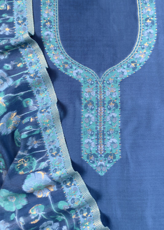 Royal Blue Satin Silk Unstitched Suit With Kani Weaving