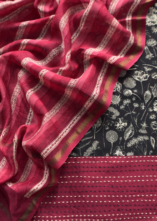 Red And Black Block Print Handloom Maheshwari Silk Suit With Kantha Work