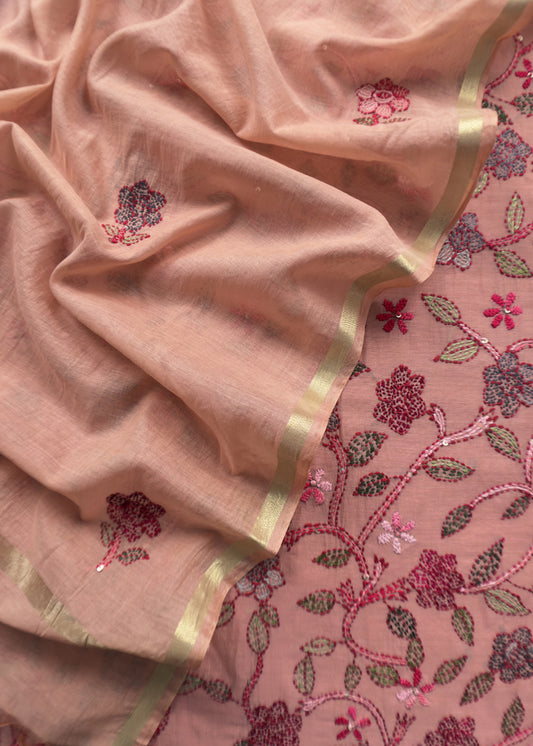Pink Kantha Embroidered Suit In Pure Mul Chanderi