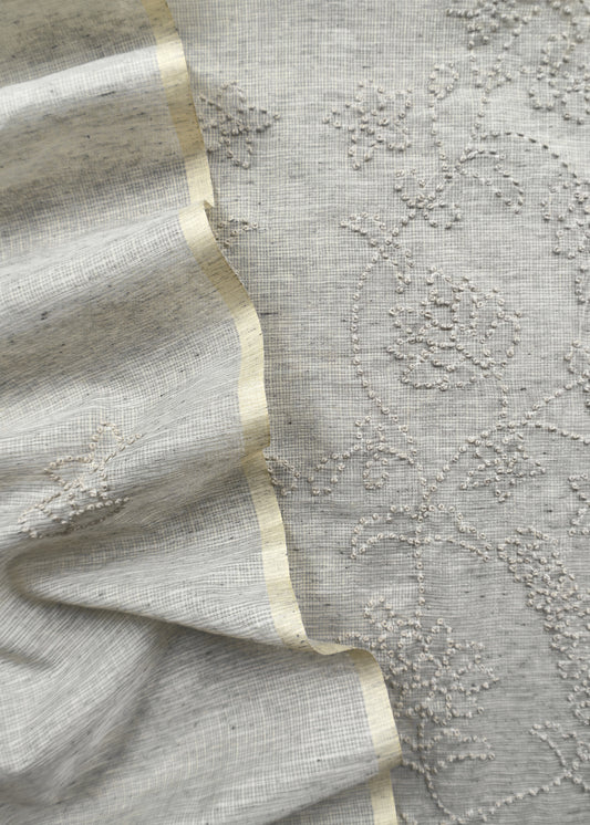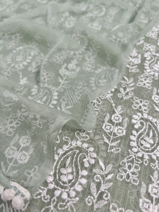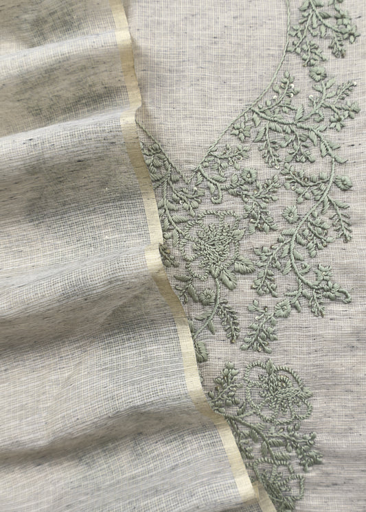 Pale Greenish Grey French Knot Hand Embroidered Kota Doria Summer Suit Set
