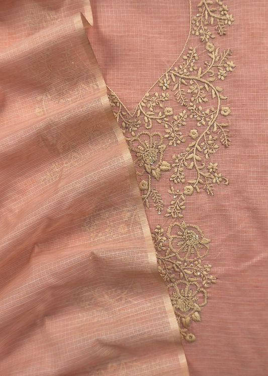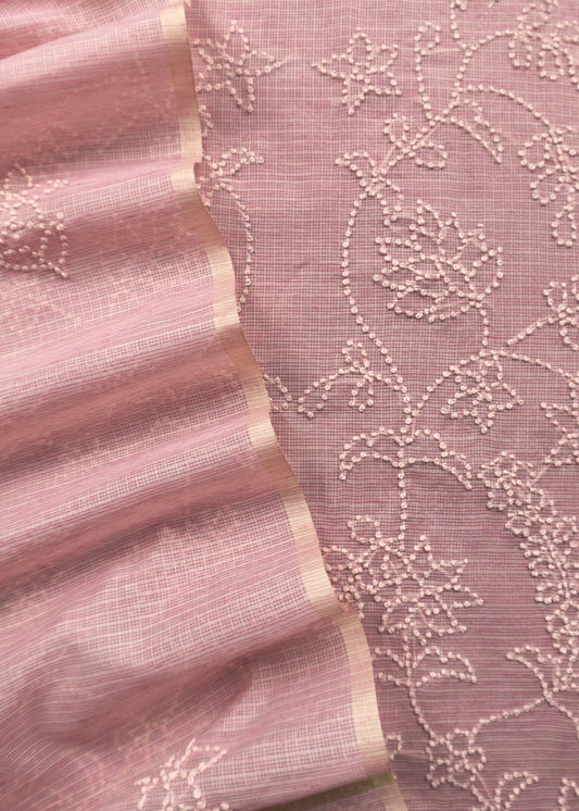 Peach Pink French Knot Hand Embroidered Kota Doria Summer Suit Set