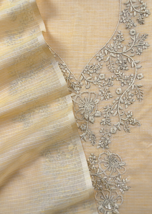 Butter Yellow Pure Kota Suit Fabric with Cross Stitch Embroidery