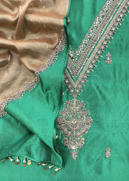 Green Handloom Silk Kurta And Tissue Silk Dupatta With Dori Dabka Handwork