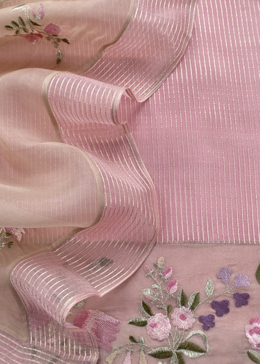 Baby Pink Handloom Kora Silk Suit Fabric With Embroidery