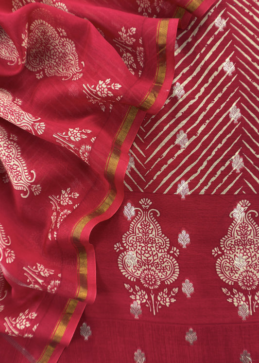 Red Maheshwari Silk Unstitched Suit With Leheriya And Block Print