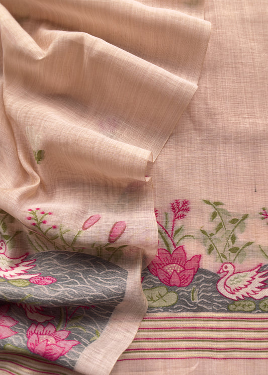 Peachy Pink Lotus And Swans Jamdani Suit In Linen Chanderi