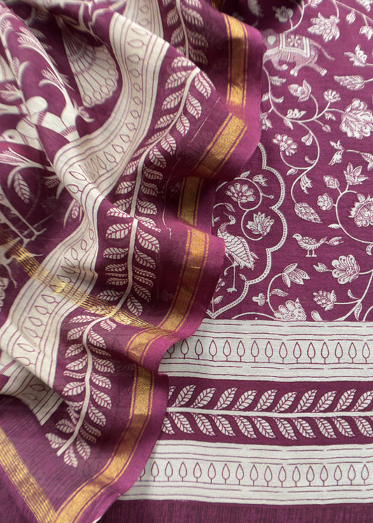 Berry Wine Jaipuri Print Pure Maheshwari Silk Suit Fabric With Traditional Parrot Dupatta