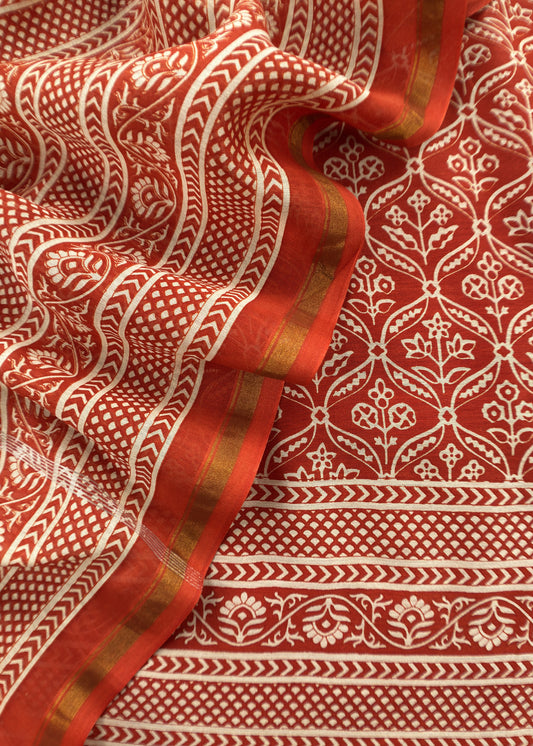 Orange Block Print Handloom Maheshwari Silk Suit Fabric