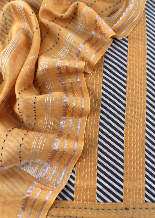 Yellow Maheshwari Silk Suit Fabric With kantha Dupatta And Kantha Stitch Hand Embroidery