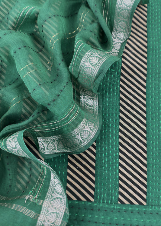 Green Maheshwari Silk Suit Fabric With kantha Dupatta And Kantha Stitch Hand Embroidery