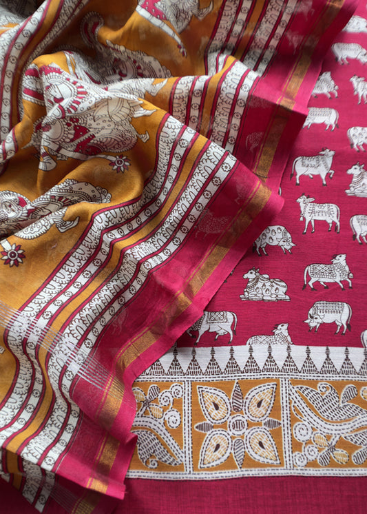 Red Pichwai Maheshwari Silk Unstitched Suit With Natraj Kalamkari Dupatta
