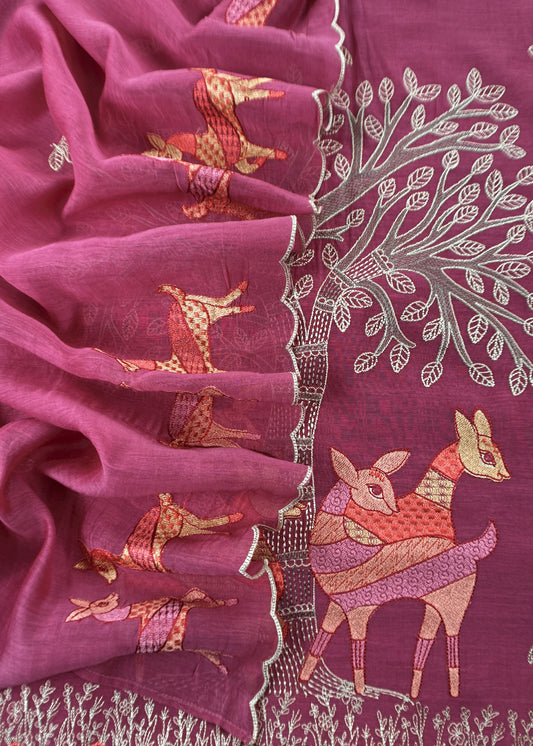 Pink Pure Mulmul Unstitched Fabric With Warli Art Appliqué Work