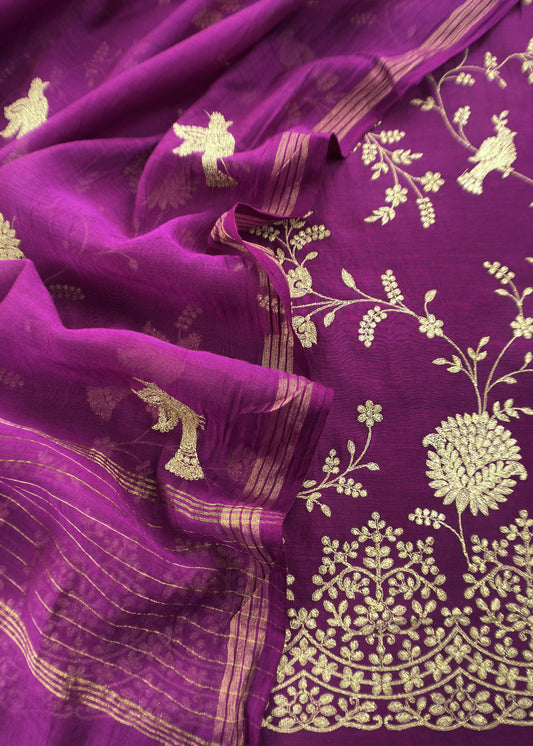 Persian Purple Chidiya Pure Mul Chanderi Suit Fabric With Aari Embroidery