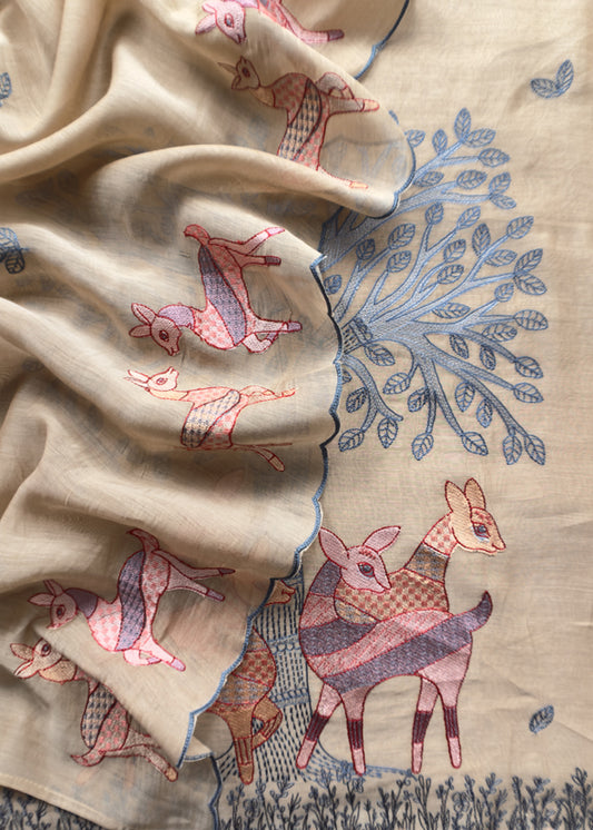 Beige Pure Mulmul Unstitched fabric with Warli art appliqué work