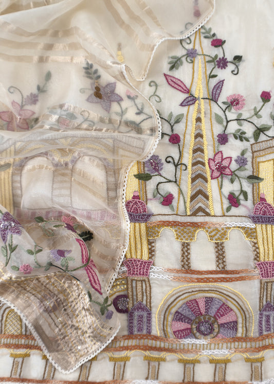 Juliet Luxe Ivory White Organza Silk Suit With Kantha And French knot Hand Embroidery