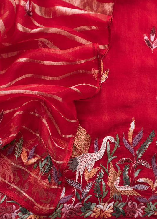 Red Handloom Organza Silk Suit Fabric With Flamingos Kantha Handwork