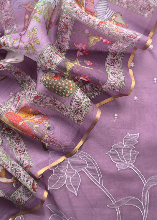 Iris Purple Pure Organza Suit With Rose Tissue Appliqué Work And Pichwai Dupatta