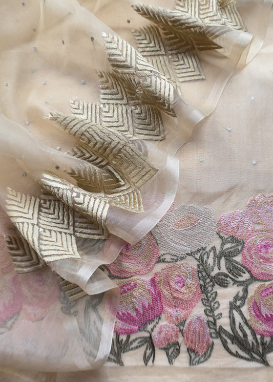 Butter Yellow French Roses Organza Silk kurta And Dupatta With Pastel Embroidery