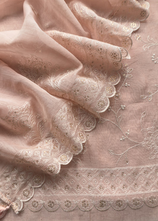 Apricot Pink Pure Mulmul Dupatta Suit With Resham embroidery