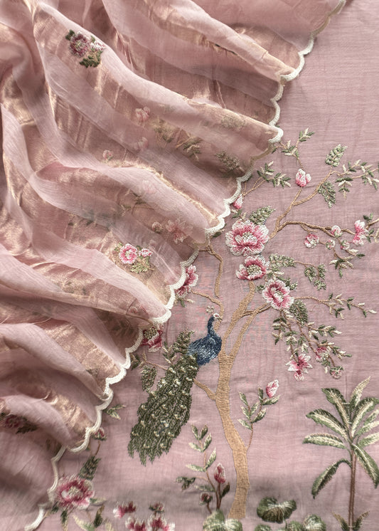Blush Pink Pure Mul Chanderi Suit With Tissue Applique Work