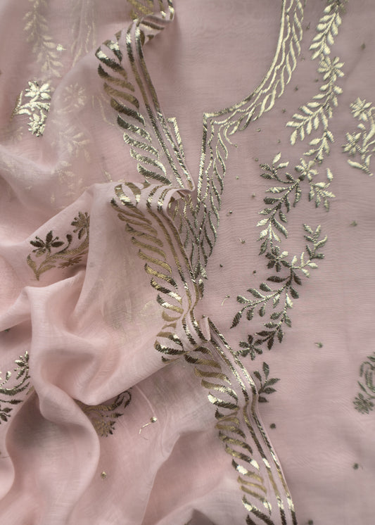 Baby Pink Handloom Mul Chanderi Suit With Gold Pitta Hand Work