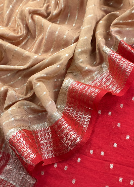 Red And Medium Brown Banarasi Chanderi Suit With Contrast Dupatta