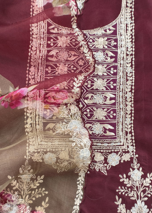 Maroon Pure Kora Silk Suit Fabric With Brush Print And Pitta Handwork