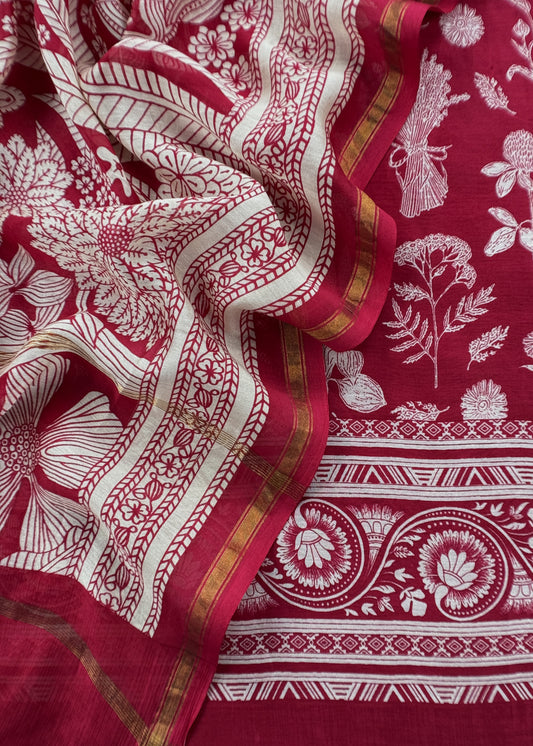 Red Ajrakh Mahehswari Silk Unstitched Suit With Dupatta