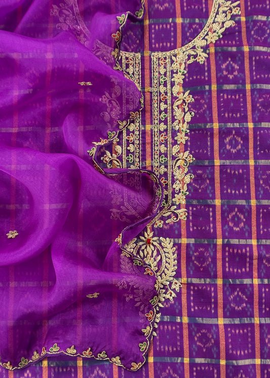 Mahalakshmi Violet Handloom Ikkat gold checks kurta and Organza dupatta with Jadau zardosi zari Handwork