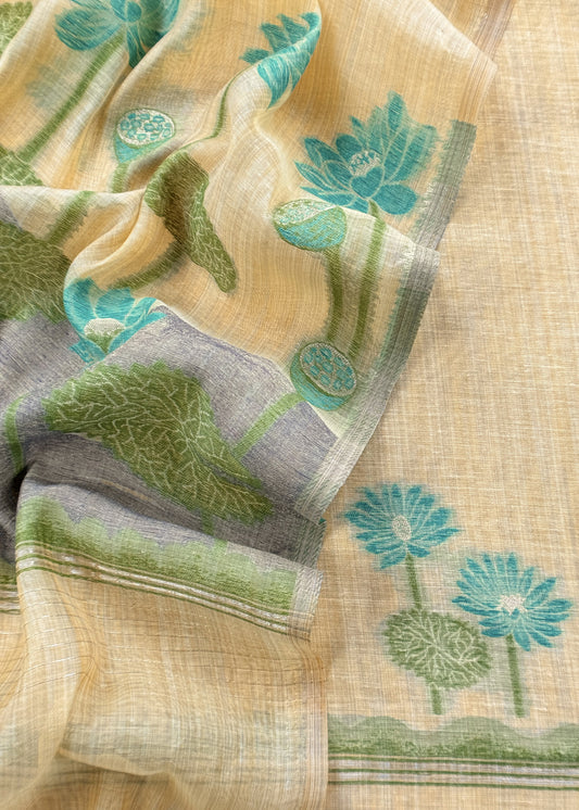 Beige Linen Chanderi Suit Fabric With Traditional Jamdani Weaving