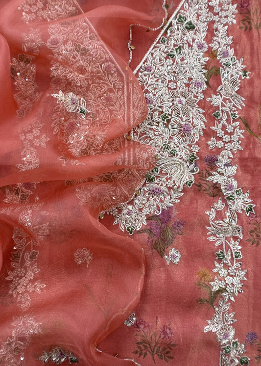 Orange Wedding Bells Pure Tissue Silk Unstitched Suit Fabric With Dabka And Zardosi Handwork