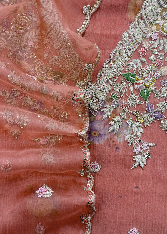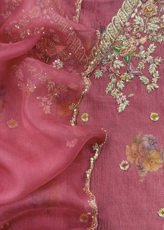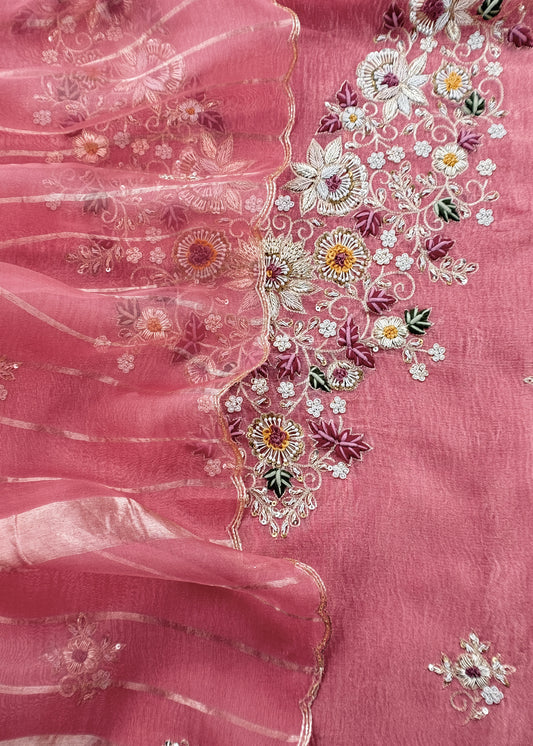 Pink Wedding Bells Pure Tissue Silk Unstitched Suit Fabric With Dabka And Zardosi Handwork