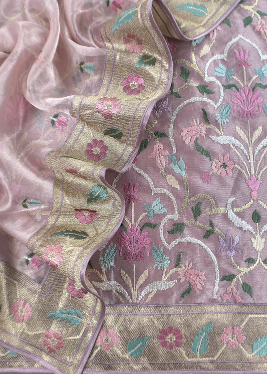 Powder Pink Handloom Tissue Silk Suit With Gold Silver Zari And Rajasthani khidki Embroidery