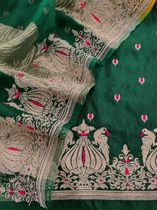 Bottle Green Tyohar luxe Mor Pure Kora Silk Kurta With Double Panel Crushed Tissue Dupatta