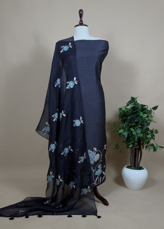 Steel Blue Kantha Embroidered Unstitched Suit In Handloom Tussar Silk