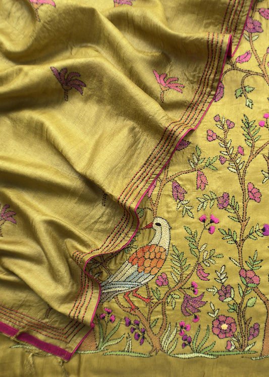 Yellow Kantha Embroidered Unstitched Suit In Handloom Tussar Silk