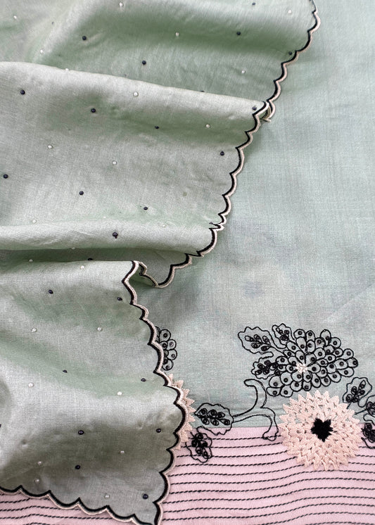Mint Green Handloom Desi Tussar Unstitched Suit Fabric With Handwork